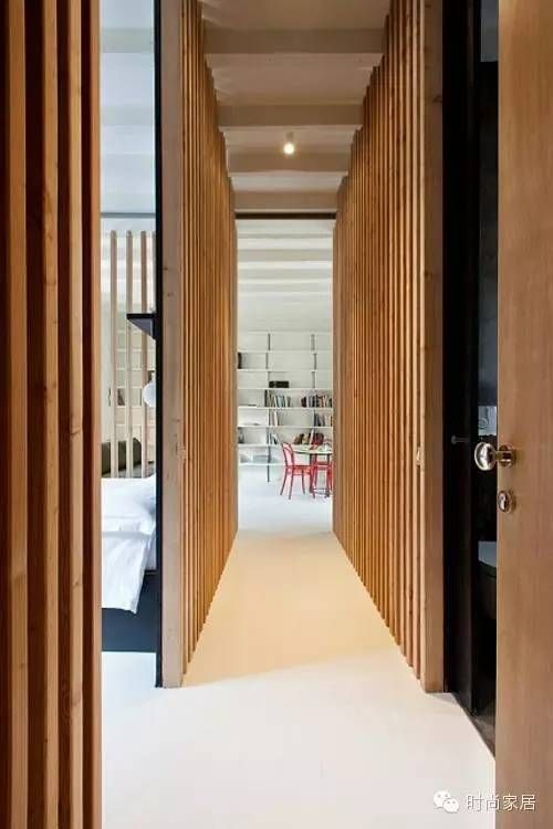▼进门通道两侧,被木格栅隔离出来的,一边是卧室,一边分别为盥洗室和厨房空间。