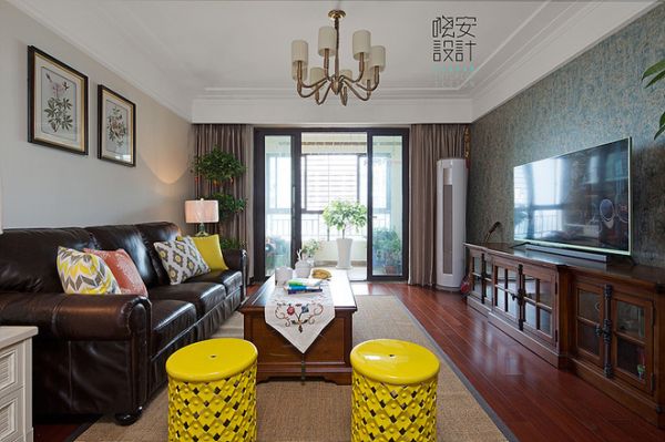 深咖色的真皮沙发增添了客厅空的厚重感,再加上柠檬黄色的陶瓷凳起到了点睛的作用,选用浅棕色的地毯,即大气又不失稳重,使整个空间具有协调感。