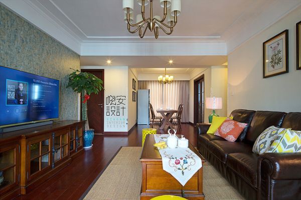 墙面选用米黄色涂料使得整个空间不是那么的有跳跃感,然而又不会让空间失去稳重感,深咖色的沙发,配上颜色跳跃的抱枕,使整个空间没那么沉闷。