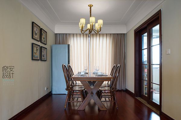 餐桌选用和木地板颜色相近的材料,使得整个空间更协调,但是会有一些沉闷,所以选用米黄色的墙面涂料,给人另一种的眼球冲击,更有居家的感觉。