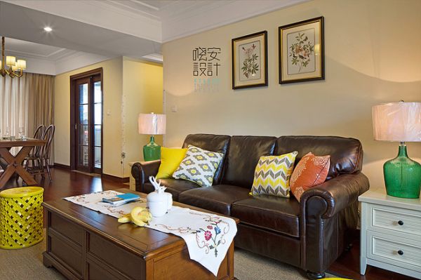 绿色的琉璃玻璃台灯相呼应,使得空间的色彩有多彩的效果,弱化了深色的地板带来的压抑感。