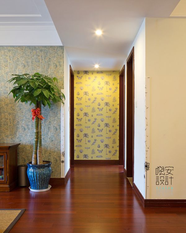 黄色的墙面,配上植物和昆虫的图画,使整个走廊更富有生机,然后加上绿植的衬托,更有一种让人心情愉快的感觉。