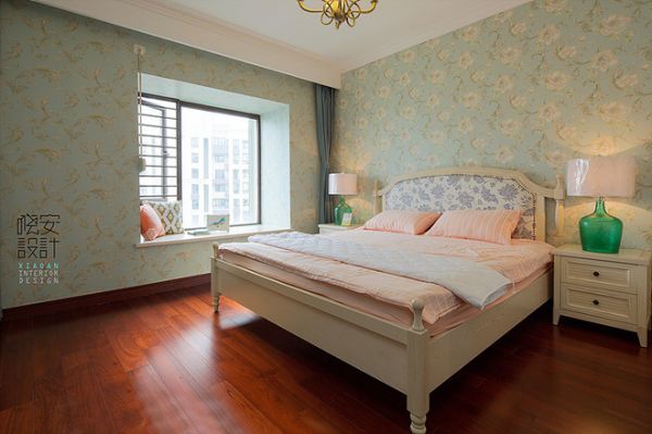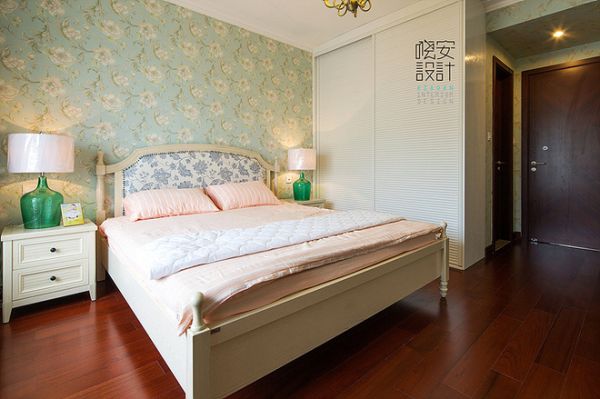 主卧室的色调淡绿色暗纹墙纸配上米白色的家具,有一丝丝温馨小女人清新,再配上深色的地板,整个空间就富有多样性。