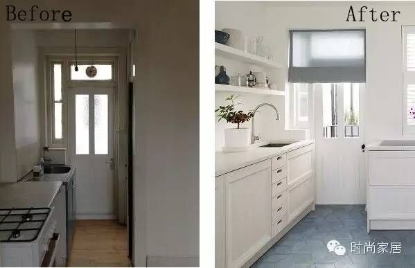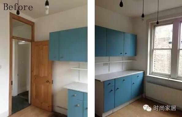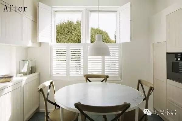 被岁月齿轮碾过的老房间,果然陈旧不堪,之前的窗户改成了百叶窗,蓝色的柜子统一换成了白色,吊灯也相对简约精致了许多,之前的木地板也换成了蓝色的摩洛哥瓷砖打造出一个明亮清新的用餐区空间。