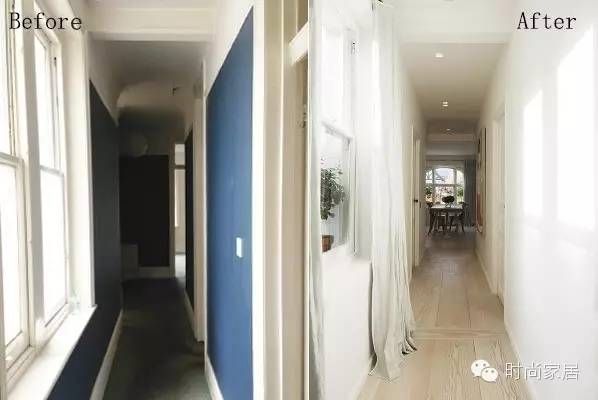 之前的走廊比较昏暗,设计师将之前蓝色的墙面被粉刷成了白色,令走廊明亮了许多,同时又连接了客厅的空间,打造出一个开放式的横向客厅。