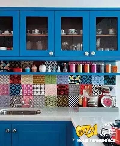 瓷砖,就是厨房的“新衣”。蓝色的厨柜,白色的台板,中间镶嵌着拚缝的碎花布般的瓷砖,略带着波西米亚的野性和不拘一格,每一块瓷砖的花纹都各不相同,搁板上摆着与花布墙相一致的五颜六色的瓶瓶罐罐,色彩对比鲜明,漂亮的厨房就这样练成。
