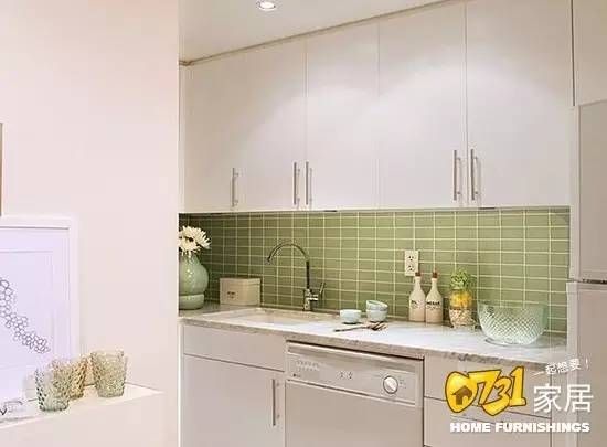 祼粉色一般都用在卧房,而用在厨房就很少见了,祼粉色的中间镶嵌着一段草绿色的瓷砖,显得十分清新,洋溢着自然的气息,与浅色的橱柜搭配在一起,让人感到十分轻松愉快。