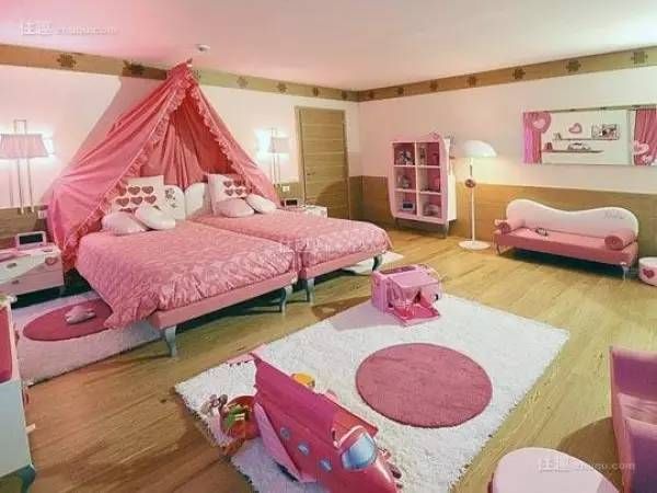 图中儿童房为现代风格,房间格调温馨,色彩以原木色为主,墙面为粉色,地面为原木色。细节亮点在于地板色,个性色彩等。