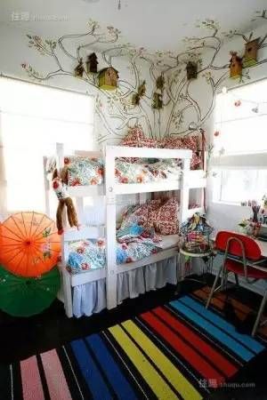 格调温馨,细节处突出床头,手绘,个性色彩等亮点,展现出彩色儿童房的空间特点;搭配以白色墙,黑色地面,完美体现混搭风格家居设计的典范。