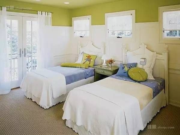 格调童趣,细节处突出床头等亮点,展现出绿色儿童房的空间特点;搭配以白色墙,米色地面,完美体现美式乡村风格家居设计的典范。
