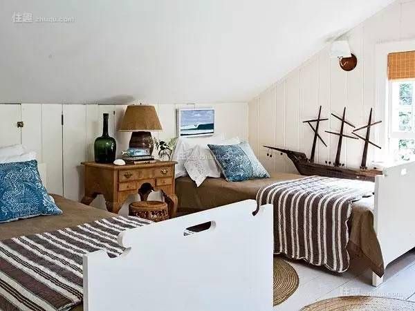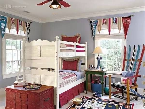 图中儿童房为美式乡村风格,房间格调童趣,色彩以米色为主,墙面为白色,地面为白色。细节亮点在于床头等。