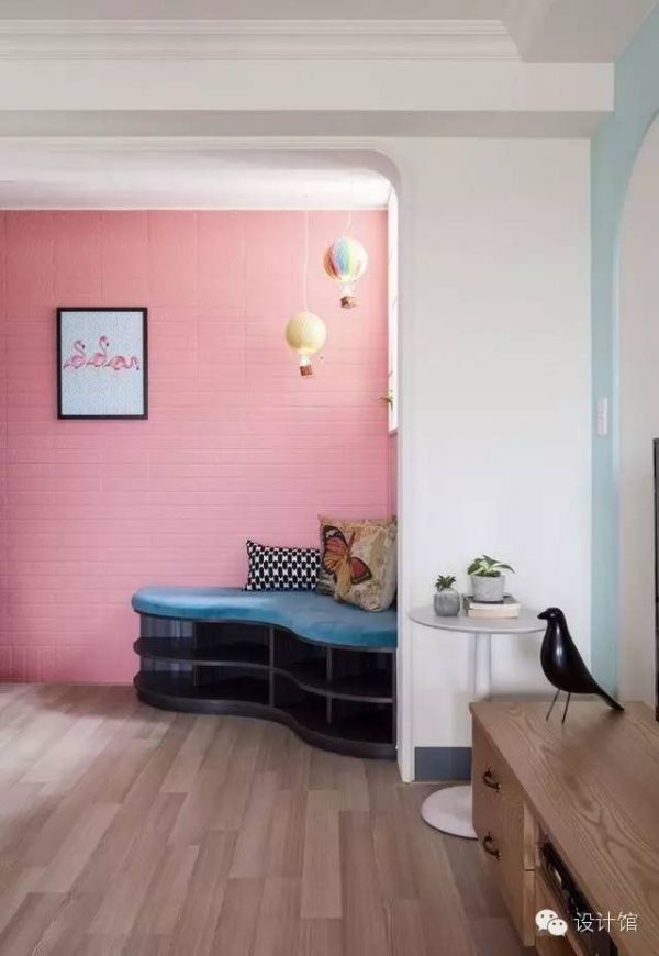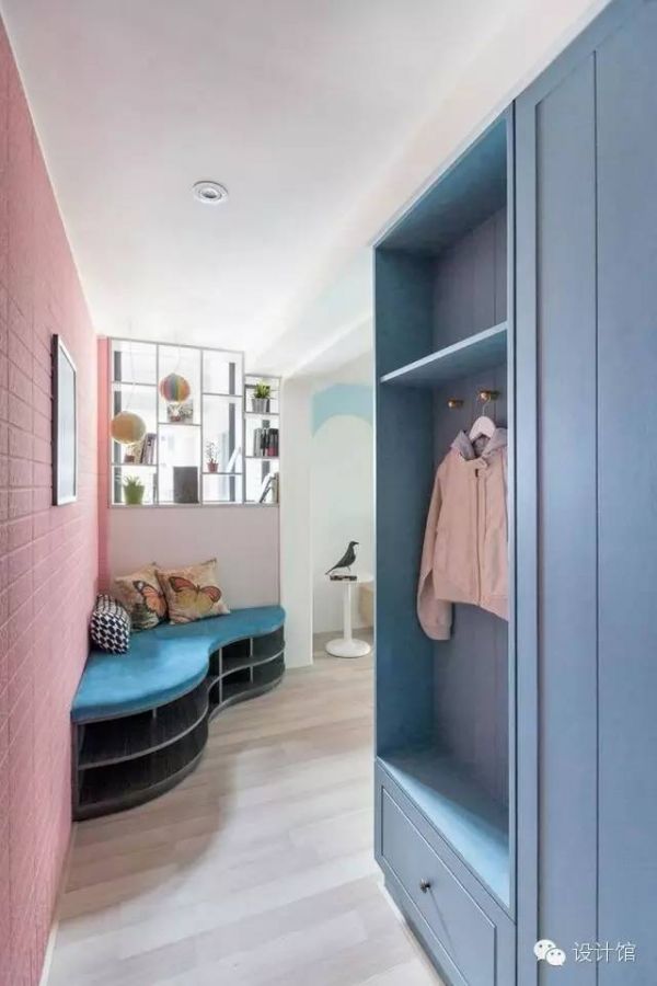↘玄关中的换鞋凳造型与色彩都相当独特,下方双层的收纳鞋层;右手边还加入了小小的入户衣帽间,彰显主人对生活享受的气质。