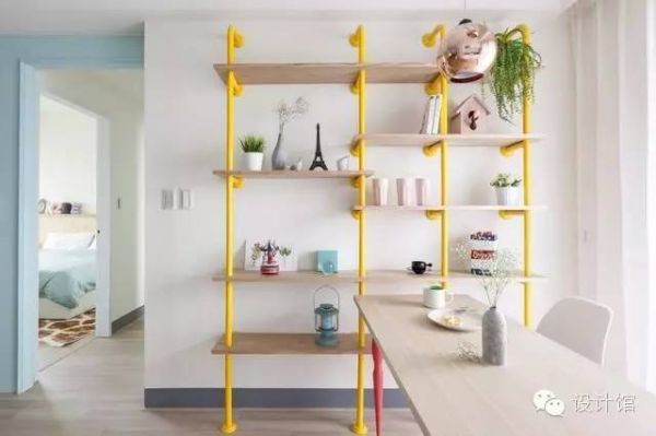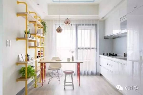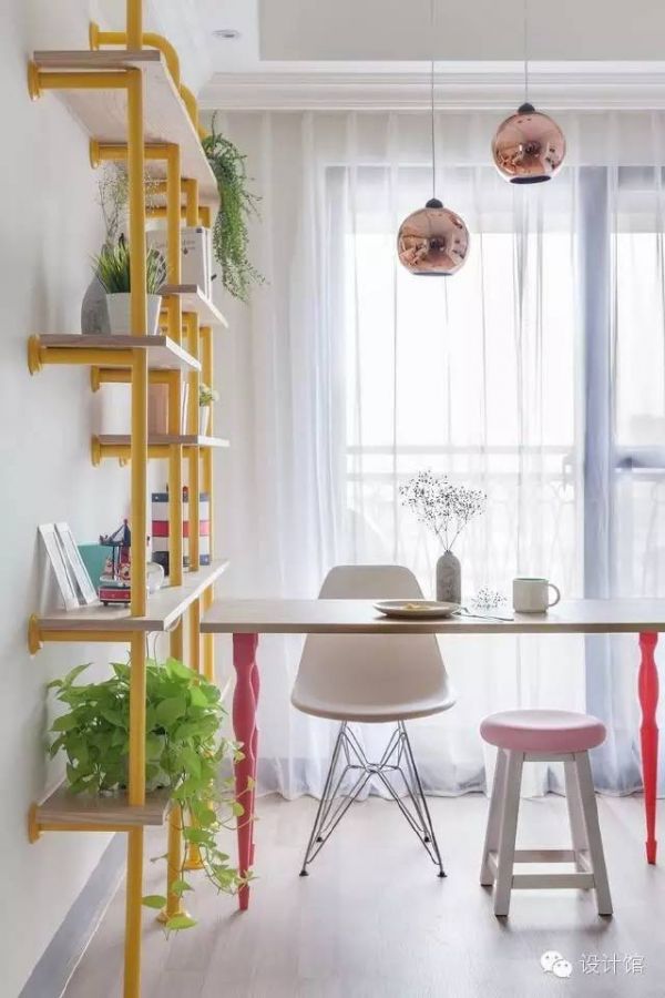 ↘既是餐桌又是书桌,同事还在靠墙一侧做创意书架,并在书架上放置清新的绿植。