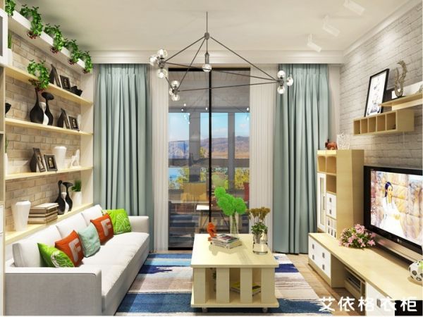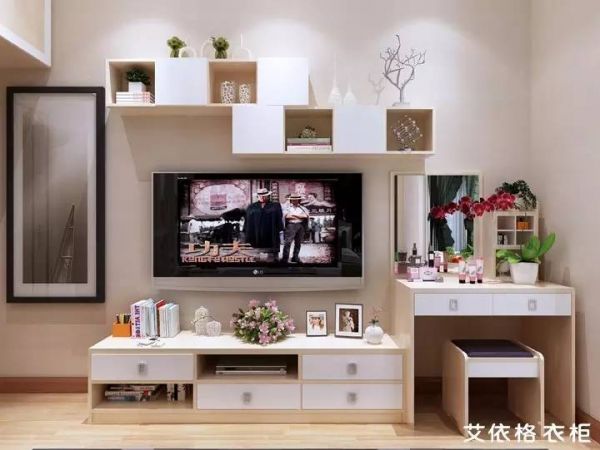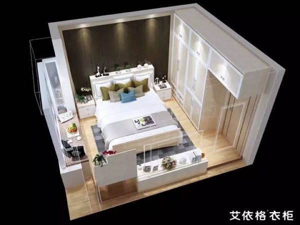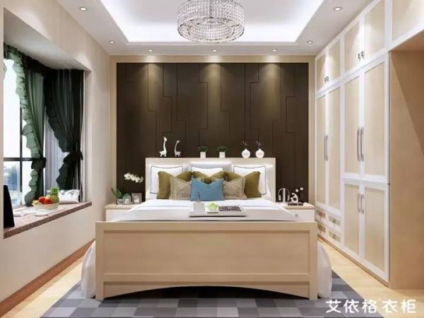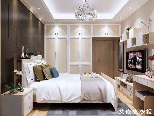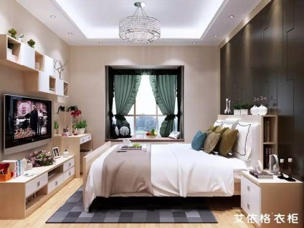 木头质感的衣柜清新爽朗,白色的边框切割让衣柜线条分明。电视柜和上空的吊柜以及梳妆台都是统一的装修风格,空间显得和谐自然。大床柔软舒适,飘窗把外面的美景收入眼底,梦里都是美好的愿景。