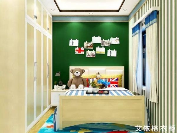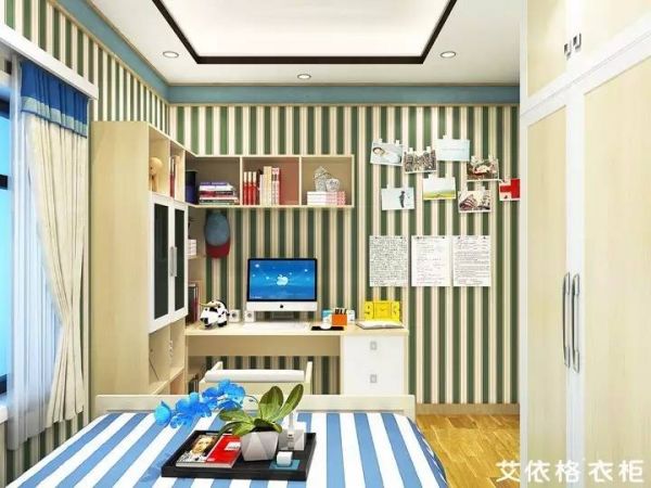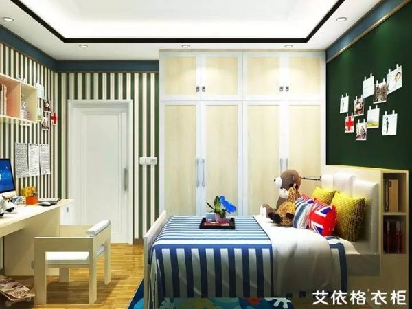 无忧无虑的童年从这里开启,绿色的背景墙和条纹状的背景让人眼前一亮,就像是身处在大地草原之中,心情也为之爽朗,书柜和书桌相结合,外露的格子不仅可以放置书籍,也可以把玩具纳入其中,有书有玩具,有知识有童年,让孩子赢在幸福的起跑线上。