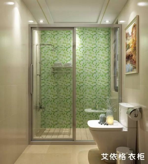 推开门,深浅不一的墙面绿色马赛克让人心情舒爽,好像一团种在墙上的草。洗手台的设计通透而又有设计感,清新怡人,卫生间也可以如此迷人。