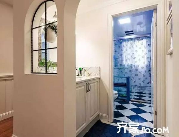 卫生间干湿分区,旁边开了个弧形小窗与弧形门洞相呼应,挂上一盆小花,摆上一颗绿植,顿时清新自然许多,也让这个素白的空间多了一些色彩。
