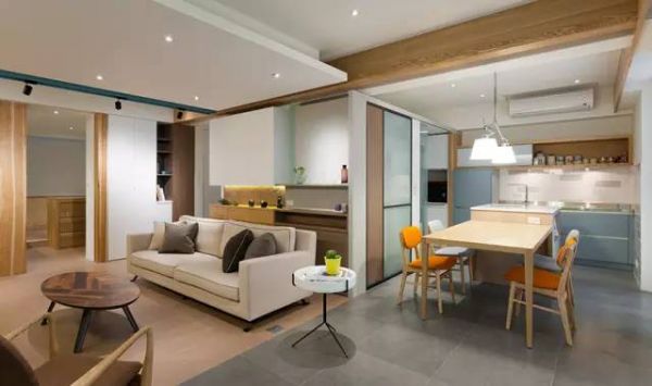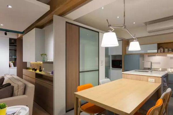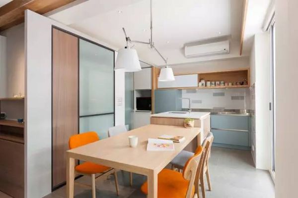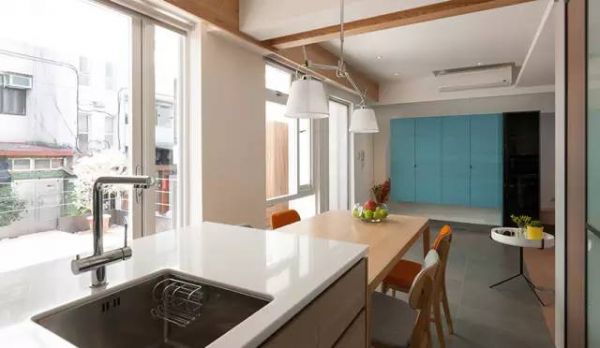 家裡也有可以变成户外露台的空间吗?千万别为了室内使用而外推,除了可能误触法规,也会导致光线被遮蔽无法进入喔!改造时不妨试著打造成花园日光室吧,就像由这套重新翻修 40 年老公寓,拥有位在一楼区域优势,多了宽敞平台创造家中小朋友活动游戏区,同时搭配玻璃落地门窗,顺势结合靠窗区开放大厨房,喜欢料理的屋主,能够边享受阳光边做幸福甜点,未来还可变成料理教学教室。室内则延续阳光元素,再增加木头材质强化温暖度,譬如木製拉门、蓝色喷漆染色收纳柜、木作包梁等,让家中充满更多自然生活氛围。不过老房子总是容易遇到梁柱压迫困扰,设计师推荐透过色彩、延伸下方形成收纳柜,或者使用木板喷漆当天花灯架强化线条,都能有效创造舒适感受。还在考虑要不要外推阳台的你,先来看看想些好点子后再决定吧!