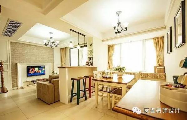 现代美式风格,整个空间看上去自然,温馨,高雅。在每一处的天花板都合理的安装吊灯和谐统一,绿色和红色的吧椅,色彩明亮,放在这里更添魅力。