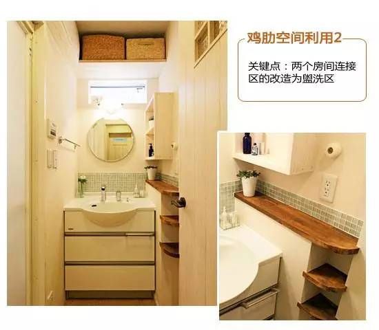 盥洗台及墙壁之间的余留空间非常小,可就势自制隔板,肥皂盒等小物品就有了容身之地