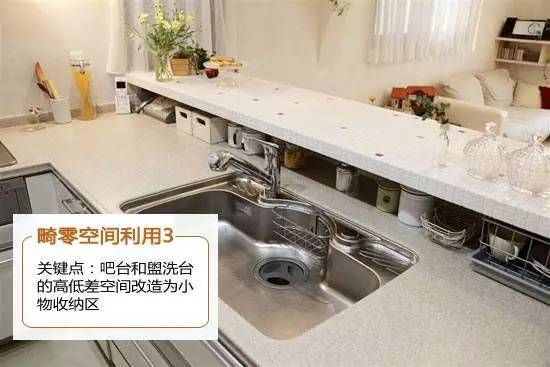 水池台跟吧台因高低差而留出了一块小空间,这样零碎的小空间摆放厨房调味品的瓶瓶罐罐再好不过了