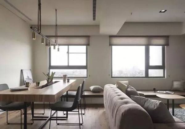 沿着窗边配置整排可休息兼收纳的卧榻坐席,并透过软装饰分布界定客厅、餐厅位置。
