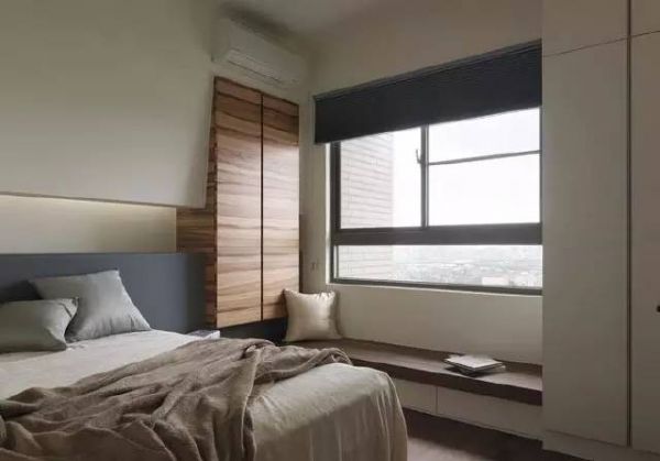 主卧室以温润的木地板铺陈,床头板延续公共空间的灰色调,让视觉流畅统一。