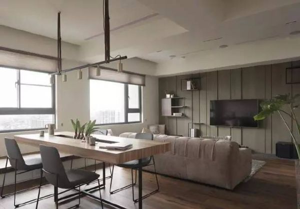 从玄关墙面延伸到客厅的电视主墙面,以木作刷上水泥,温暖中呈现粗犷气息。