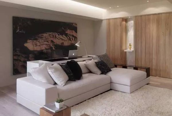 L 型白色沙发与简约的电视墙相映,诉说着屋主自然惬意的生活精神,而工作桌后方的抽象画作,则突显居住者的艺术美感。