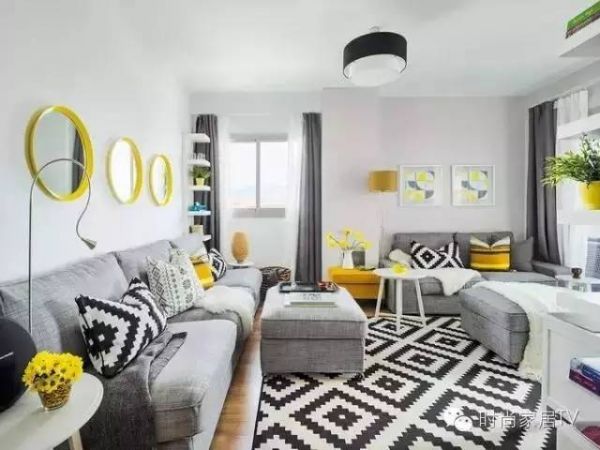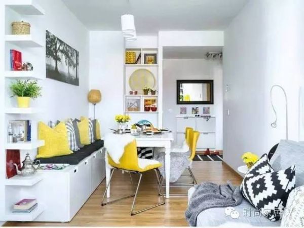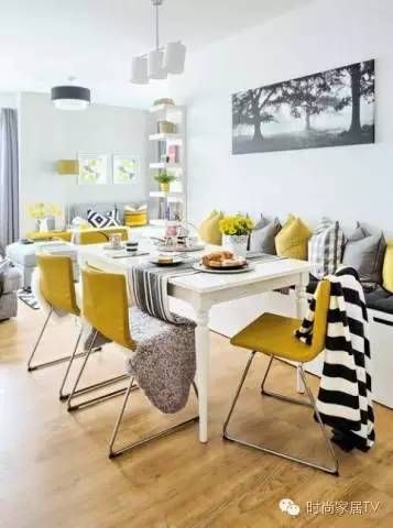 客厅和饭厅的装饰,形成了鲜明的对比。颜色方案的基础采用灰色和白色,同时利用柠檬到芥末黄色进行补充。这些亮色刷新了房间,并为空间添加了乐趣和积极性。