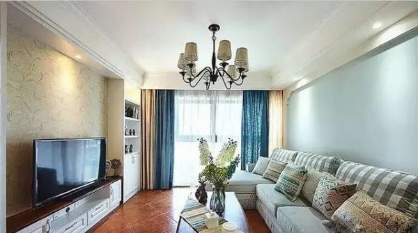 客厅全景,沙发背景墙上业主选择了蓝色了墙面漆,稍显空旷。