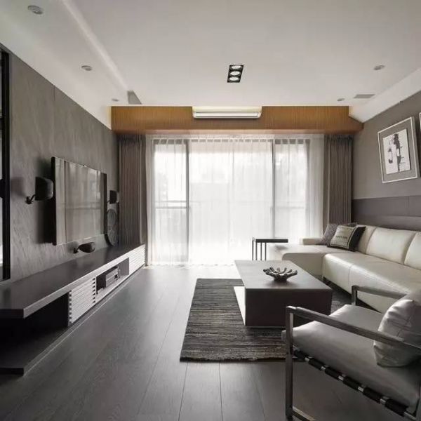 整个客厅区域选用了灰色作为主色调,从墙面到木质地板都选用了同色系的装修,非常简约大气有质感。