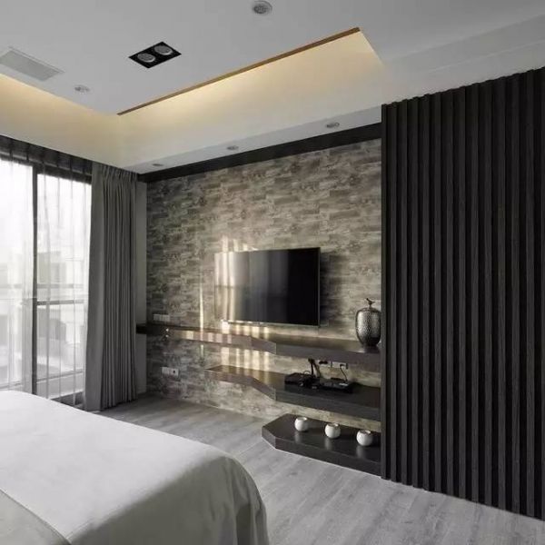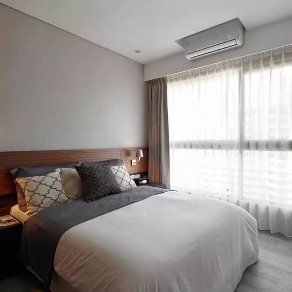 深色系总是给人一种很严肃的感觉,柔和的灯光、砂纸的窗帘,显得整个卧室柔软极了。