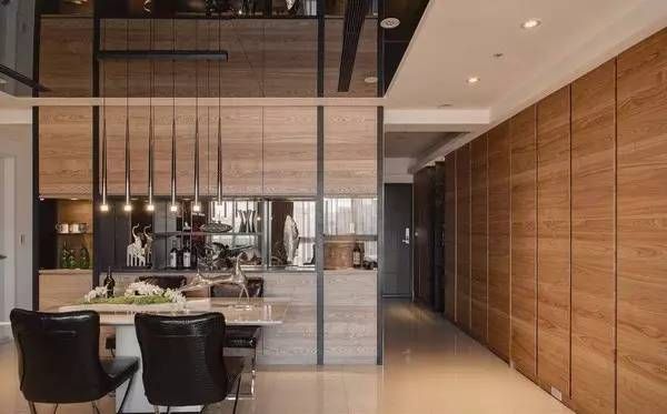 ▲由于建筑商的原厨房开门比较小,设计师透过镜面造型做大面延伸,茶镜反射加大了空间视野。