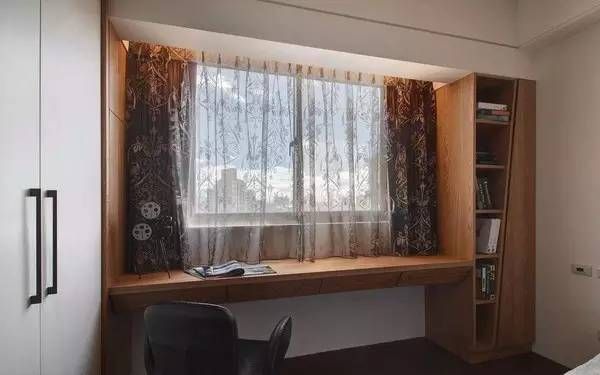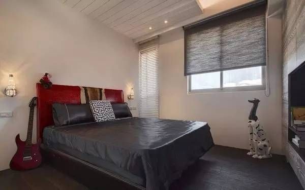 ▲卧室的设计十分个性,设计师依着业主的性格设计了这样的卧室。卧室里有一根衡量,设计师也很巧妙的用上了。主卧房内设计了一字型桌面,业主即可以在此梳妆也可以变成一个工作台。