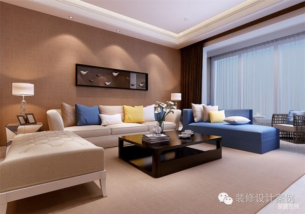 驼色的布纹墙面带来香醇沁人的安全感,米色与蓝色相互交叠的呈现在布艺沙发上。黑色的茶几安静的摆放在浅棕色地毯上,洁白的窗纱带着轻盈质感,整个空间迎来丰富的变化和层次性。