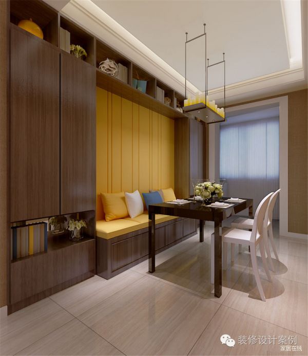 四平八稳环绕式收纳柜,极具气势的嵌入餐厅的墙面,并设计出明黄色的卡座,一举打破棕木带来的深沉,使空间全面活泼起来。极具造型感的秋千灯,营造出柔和的光感,黑色和白色也形成鲜明对比。