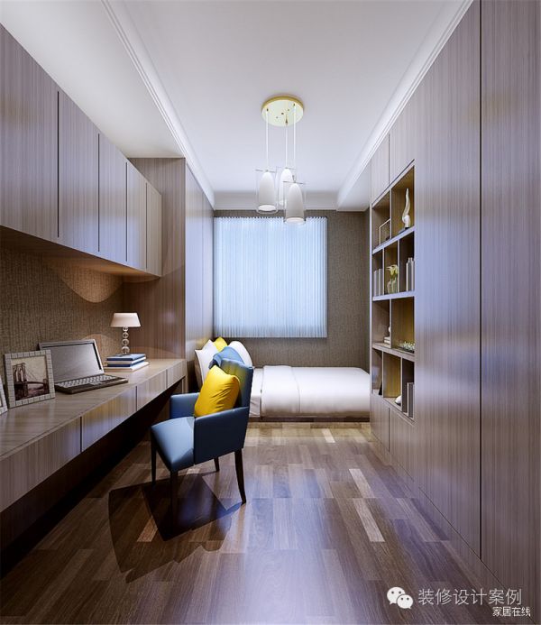 强收纳居是整个空间的主题,设计师将狭长式的卧室改造成书房、卧室一体化。大面积的入墙式收纳柜和置物架结合,收纳壁橱和长条式书桌结合,释放出更多的空间,蓝黄的点缀让空间多了一抹活力。