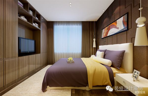 环绕式收纳也运用在卧室,使得居室井然有序。迷宫纹路软包墙与收纳柜相对称,使得卧榻区形成被温暖包裹之势,紫色床品带着优雅的气质。没有主灯,两盏垂坠灯足以营造出睡前阅读光源。