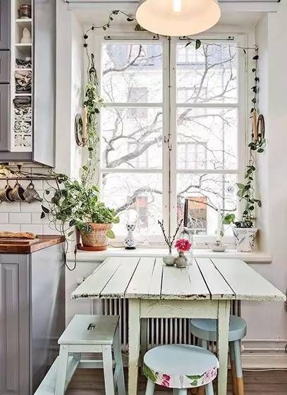 小巧餐桌和座椅,刷上一层淡淡的薄荷绿,清新怡人