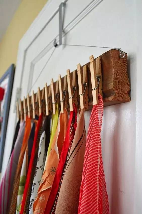 另一种收纳方法是用小夹子固定,每个夹子夹一条围巾,这种特别适合薄薄的丝巾。