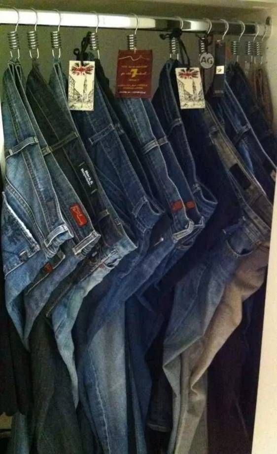 用窗帘环勾住裤子的一根腰带,挂在衣柜横杆上,并排放很多都不会嫌挤。
