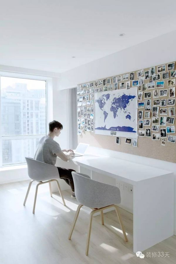 ▲ 书桌上方的墙面设计了一面超大的软木墙