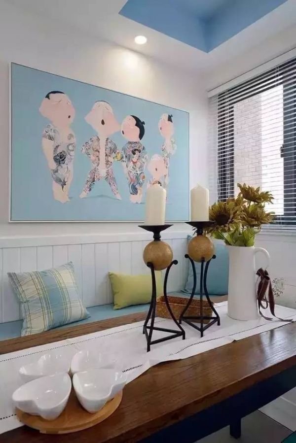 ▲也许是这幅画激发了业主的灵感,所以整个空间都是清新的蓝色。 这幅《戏仿人间》承载了多少儿时的换了记忆...