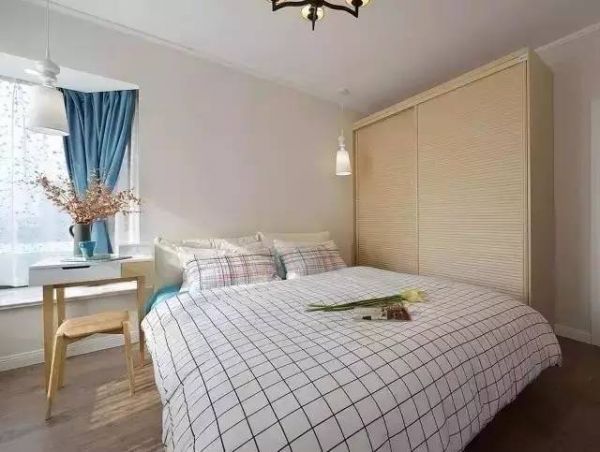 ▲格子花纹的床被与枕套,一束郁金香、一本书洋溢着淡淡的生活气息。 和式百叶衣柜,素雅精致,一盏小吊灯如绽开的牵牛花。