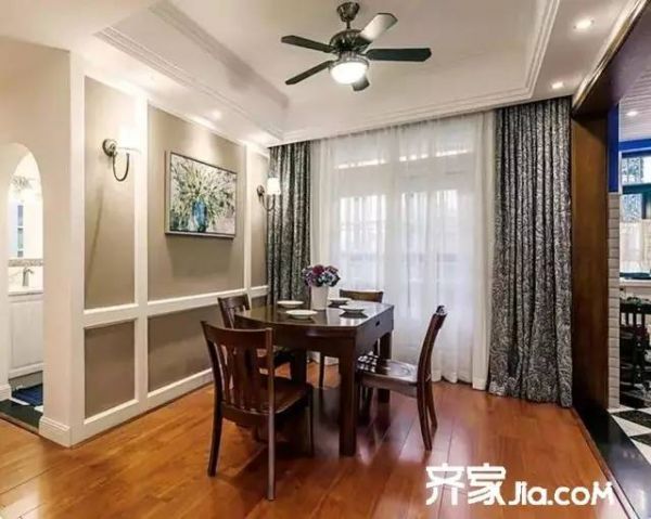 原木的餐桌椅在复古的吊扇灯的映射下显得格外温馨。白色线条对餐厅背景的简单分割,刷上淡灰色乳胶漆,再挂上一副抽象画,让整个用餐区域告别单调。
