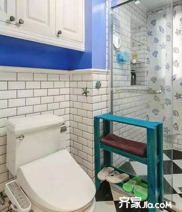 黑白的卫生间,简易的复古蓝色放鞋架成为亮点!