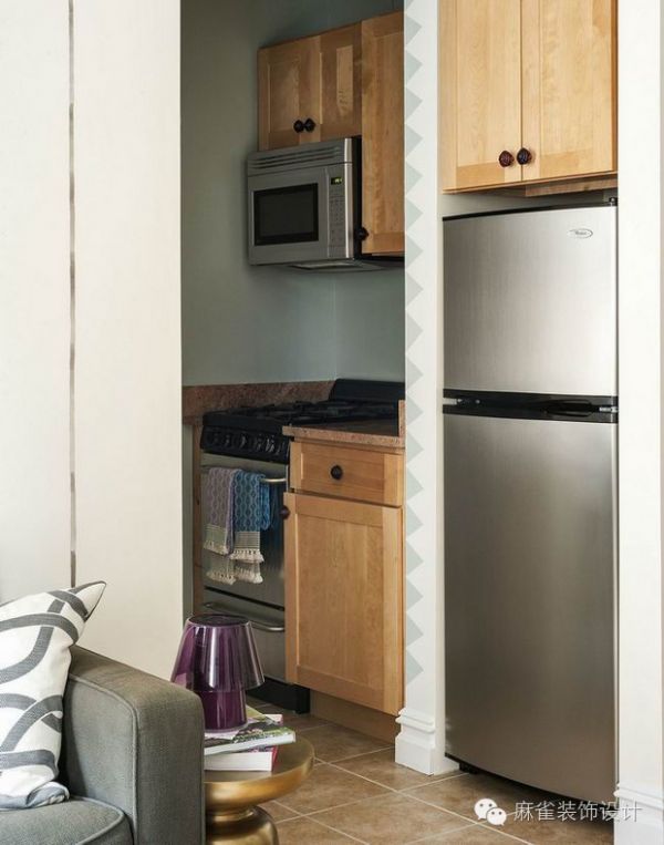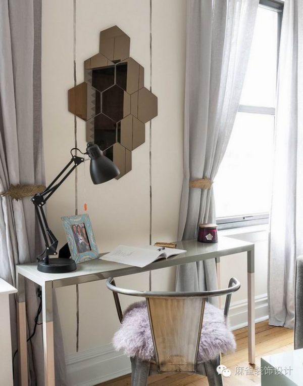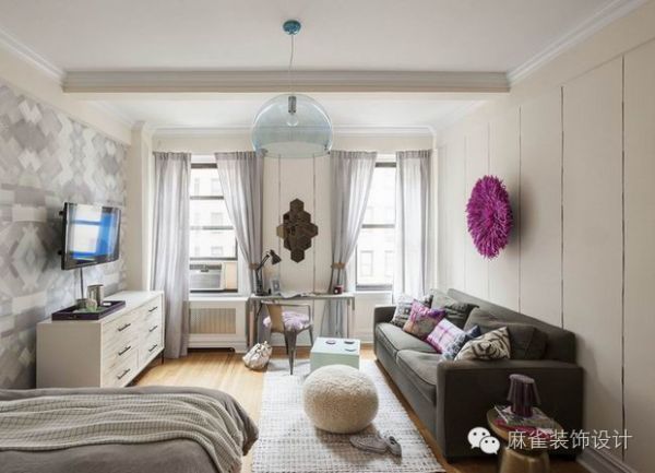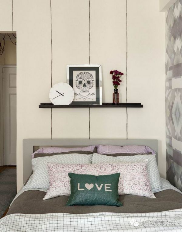 放置在窗户之间的控制台被改造成一张桌子,两个人可以舒适地享用晚餐,这里还可以作为业主工作或是在早上存放化妆品的地方。这间小公寓反映了女性的特点,丰富多彩的垫子分布在整个空间。为了最大限度地提高空间,选择了流化床上方的架子,而没有使用床头柜。