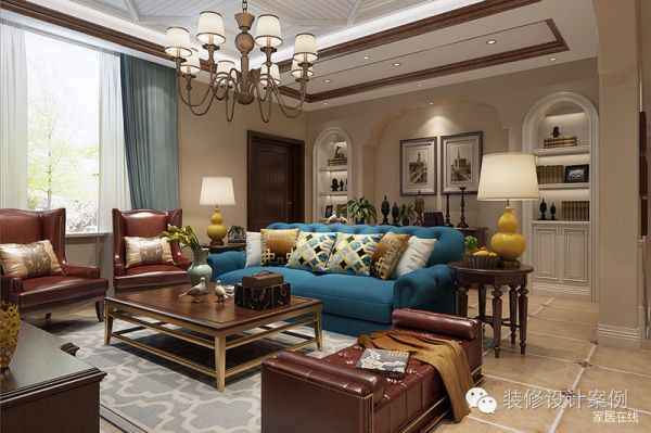 木制茶几和圆边柜搭配布艺及皮质沙发,增加了空间中材料的丰富性,也让感观大为不同;增加了挂画、摆件、来着重表现美式元素。