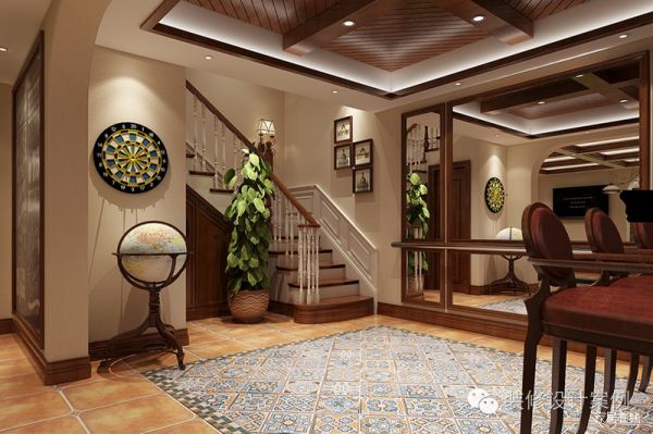 仿古砖结合土黄色墙面,从色彩和材质上最大限度的体现了随意而安的生活状态;楼梯选用白色和木色将自然萌态跃然置于空间。